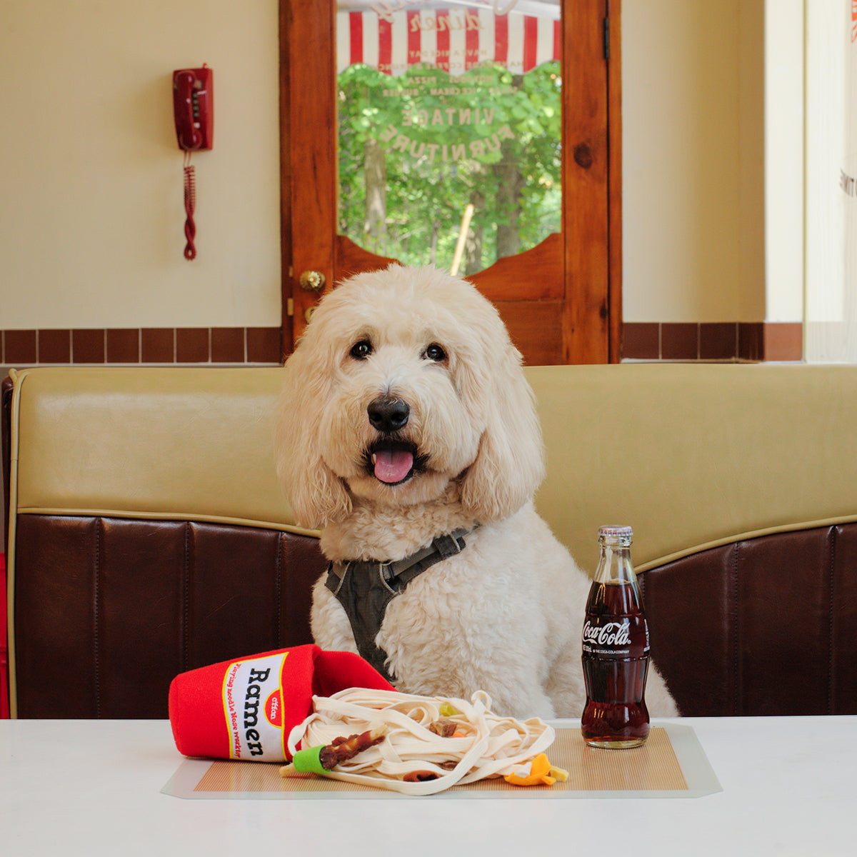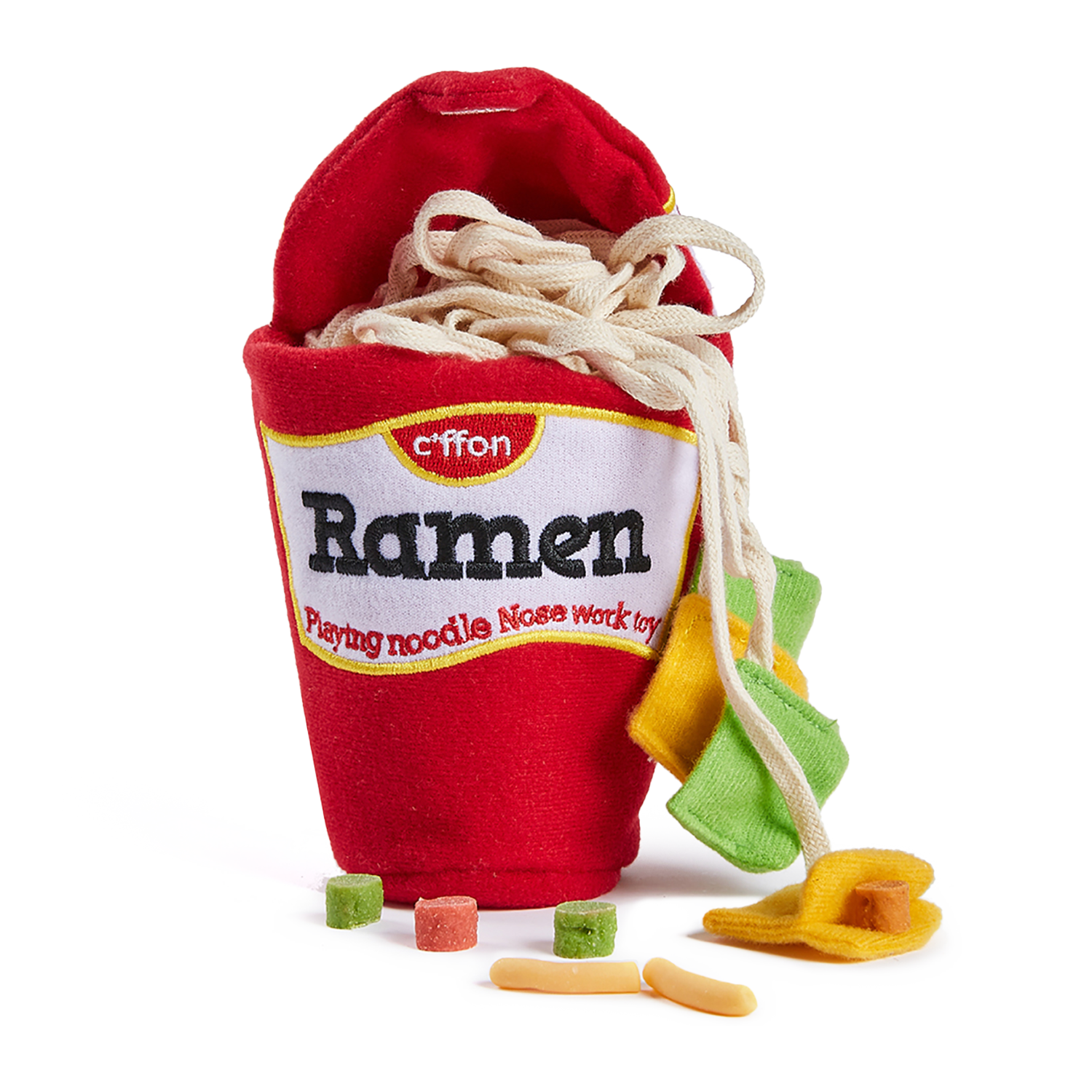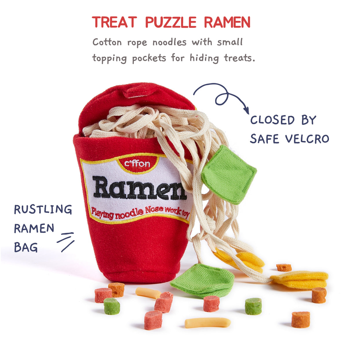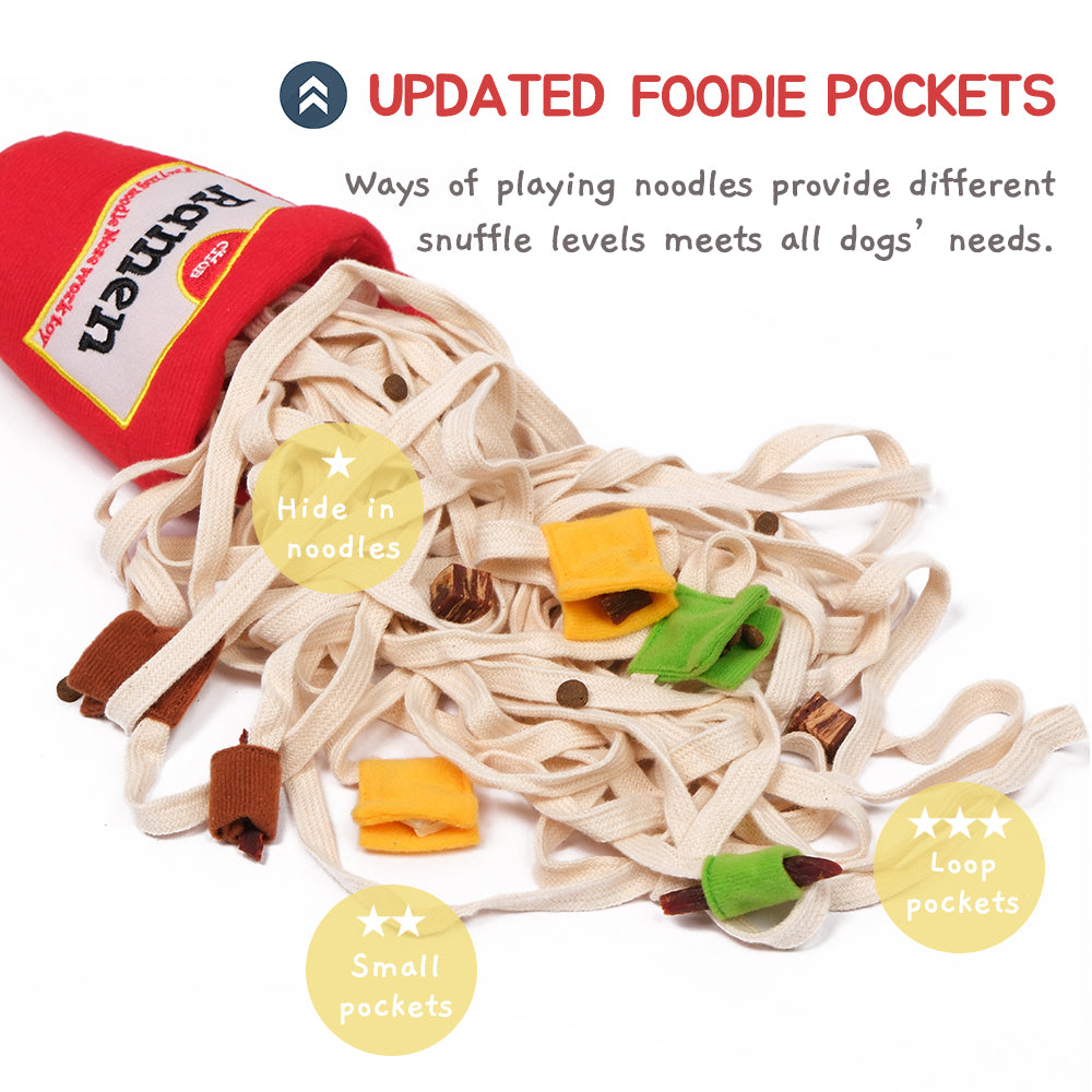 The snuffle dog ramen toy contain the noodles with 6 pieces of vegetable topping pockets and the ramen cup container with embroidered graphics. You have lots of ways of sniffing training such like hide treats in the cup or roll up with noodles. For higher level sniffing training, you could hide snacks intake topping pockets. Even the lid could be closed with the velcro. You can adjust the snuffle level by hiding treats in different area.