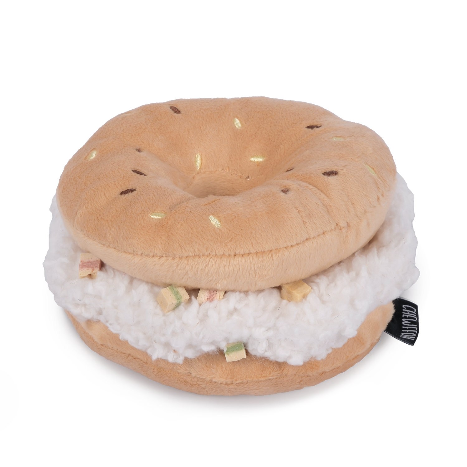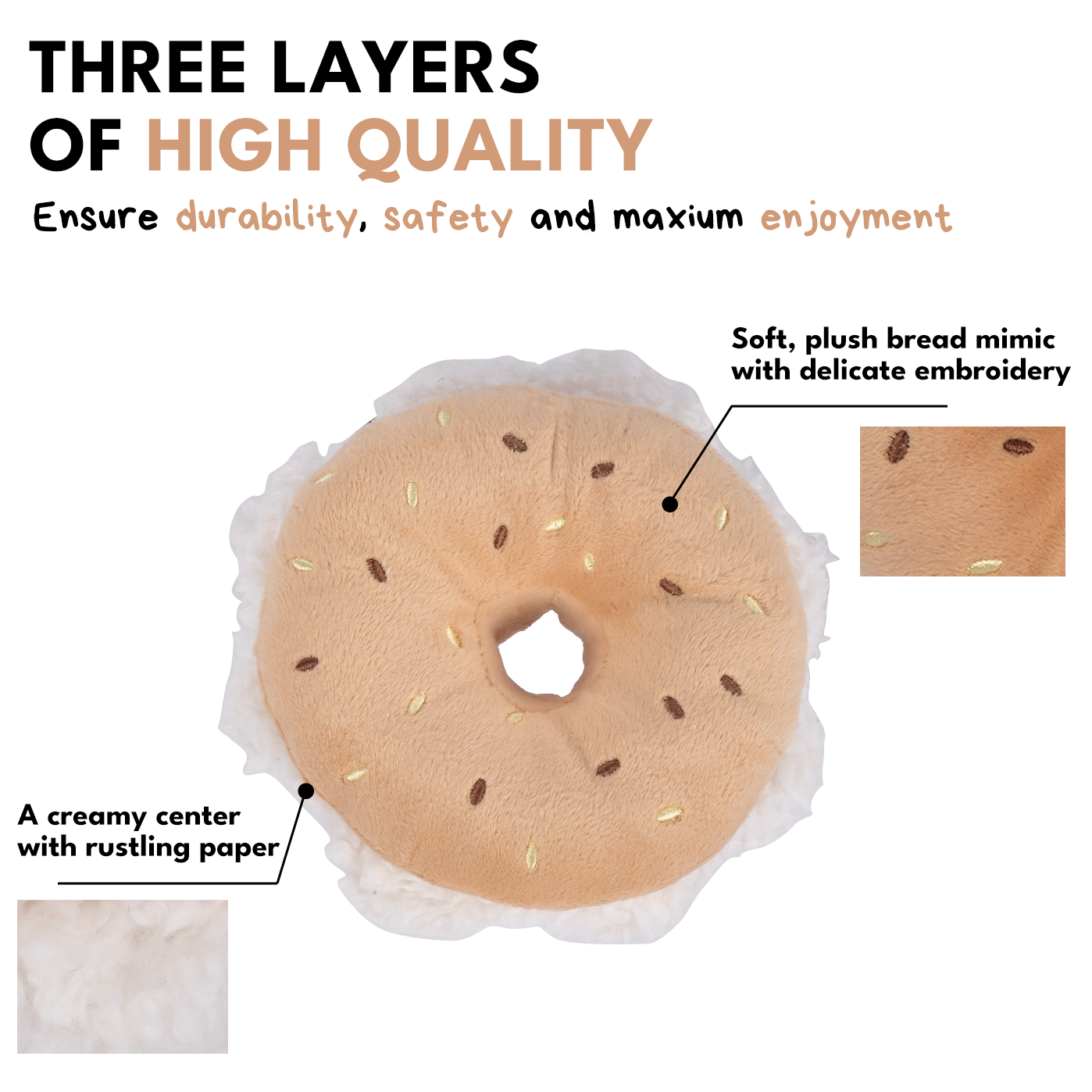 Packed with two premium squeakers embedded in the bread and crinkle papers hidden within the cream fur, this bagel toy produces entertaining sounds that'll keep your pup entertained for hours on end.