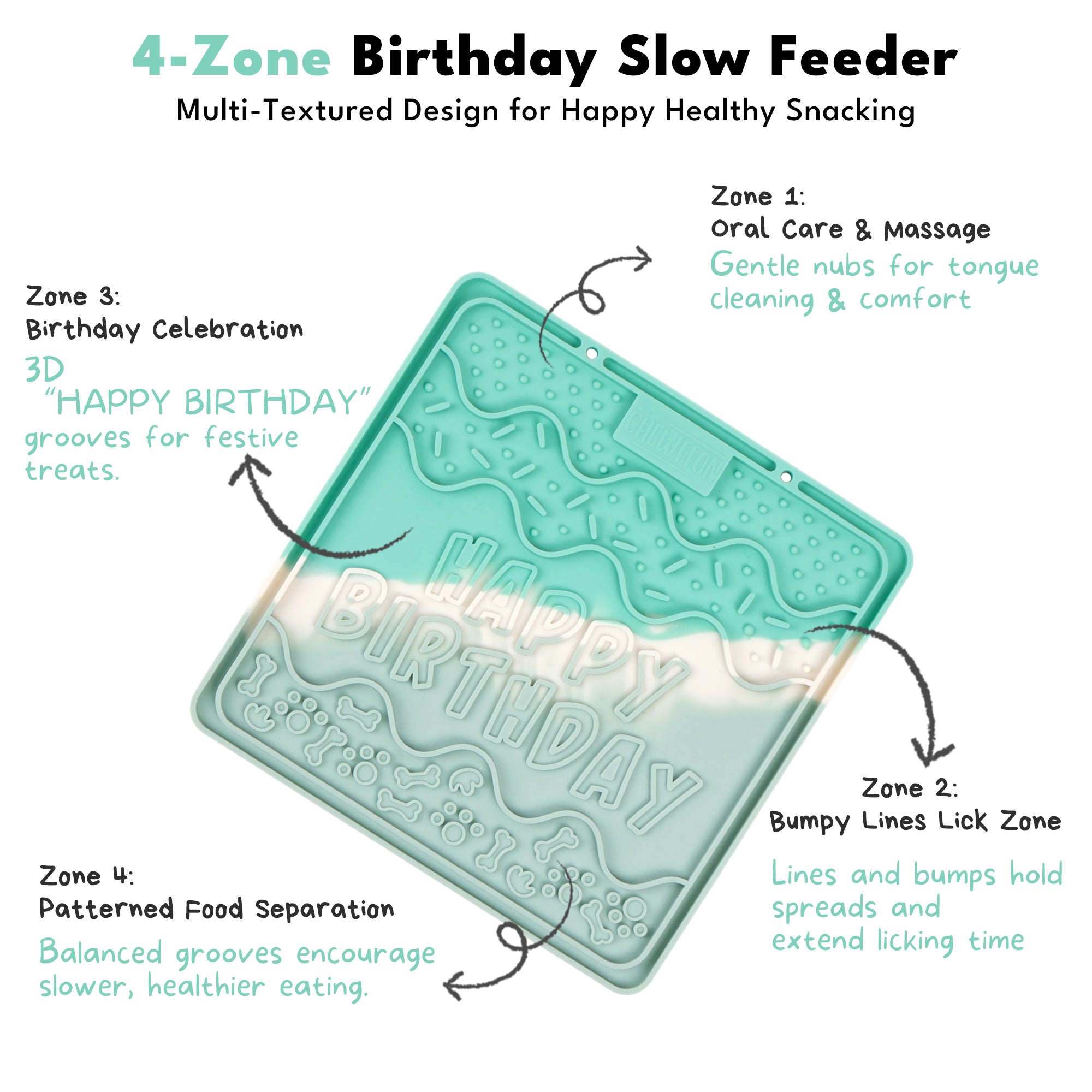 The CHEWFFON Birthday Lick Mat features an embossed “Happy Birthday” design, bringing joy and celebration to every lick. Simply spread peanut butter, wet food, or your pet’s favorite treats across the textured surface to create a fun slow-feeding experience that helps extend mealtime while keeping your pet engaged and mentally stimulated.