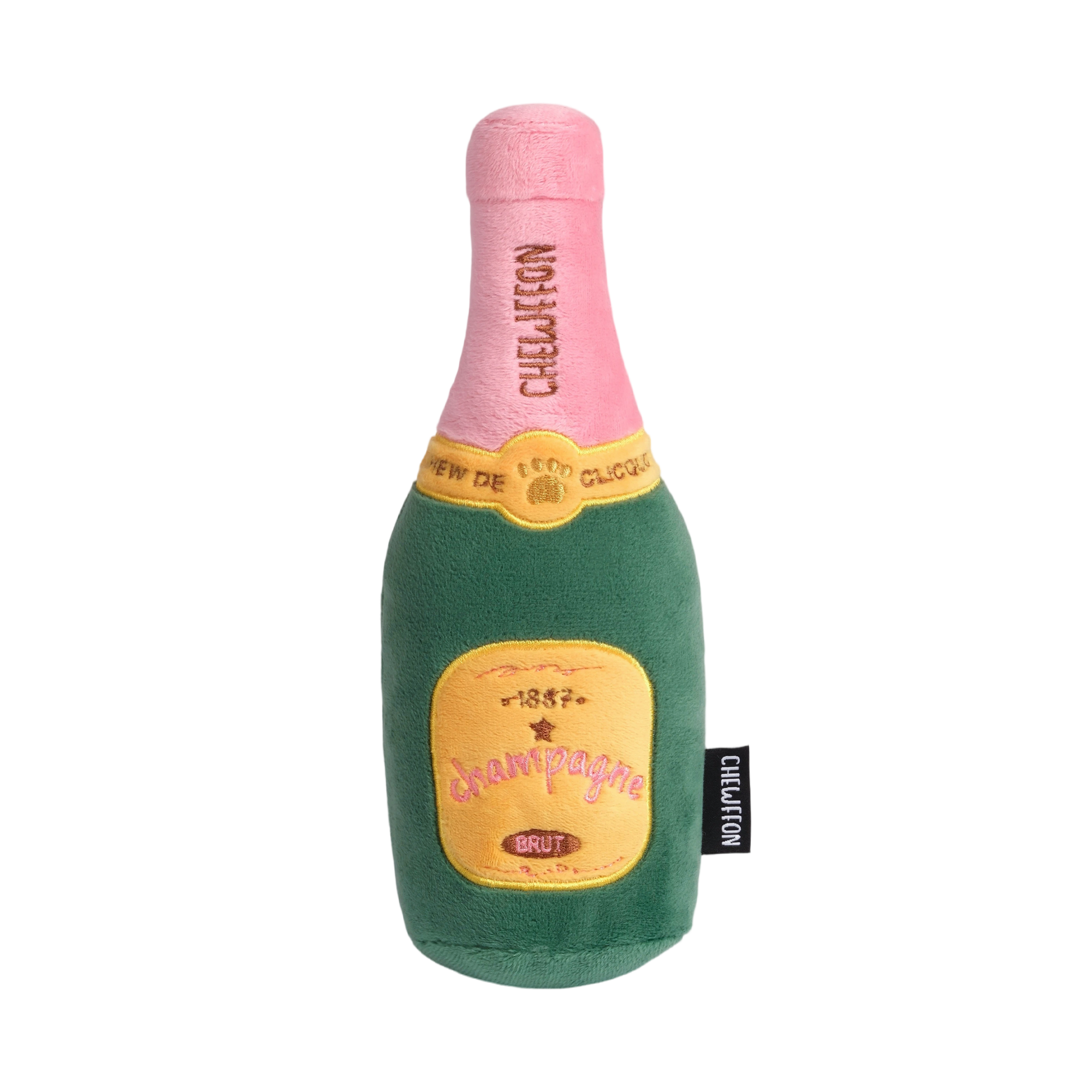 Designed with a unique champagne shape, this plush toy features a rounded base and slim neck that’s perfect for your dog to grab, chew, and carry around. The vibrant green and pink colors paired with detailed embroidery make it eye-catching for both you and your pup—bringing a playful, celebratory vibe to every moment.