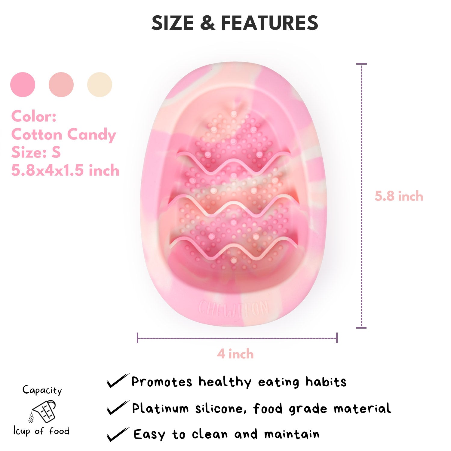 Our slow feeder is made from 100% food-grade silicone that is safe, non-toxic, environmentally friendly, and durable enough to withstand chewing. It is microwave and fridge safe and features massage dots that separate food to extend mealtime, promote healthier digestion, and prevent gulping or choking hazards.