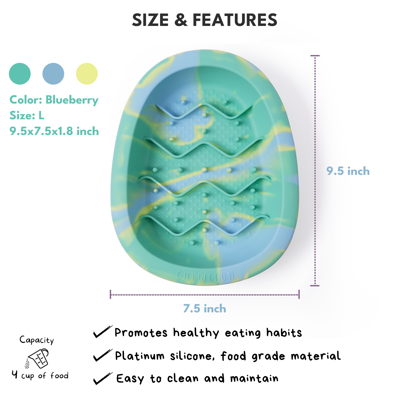Strong suction cups on the base keep the bowl securely in place to prevent spills and messes. Measuring 9.5 inches long, 7.5 inches wide, and 1.8 inches high, this bowl holds up to 4 cups of dry food and is perfect for dogs and cats of all breeds. Cleaning is a breeze with the flexible silicone – simply rinse with water or toss it in the dishwasher!