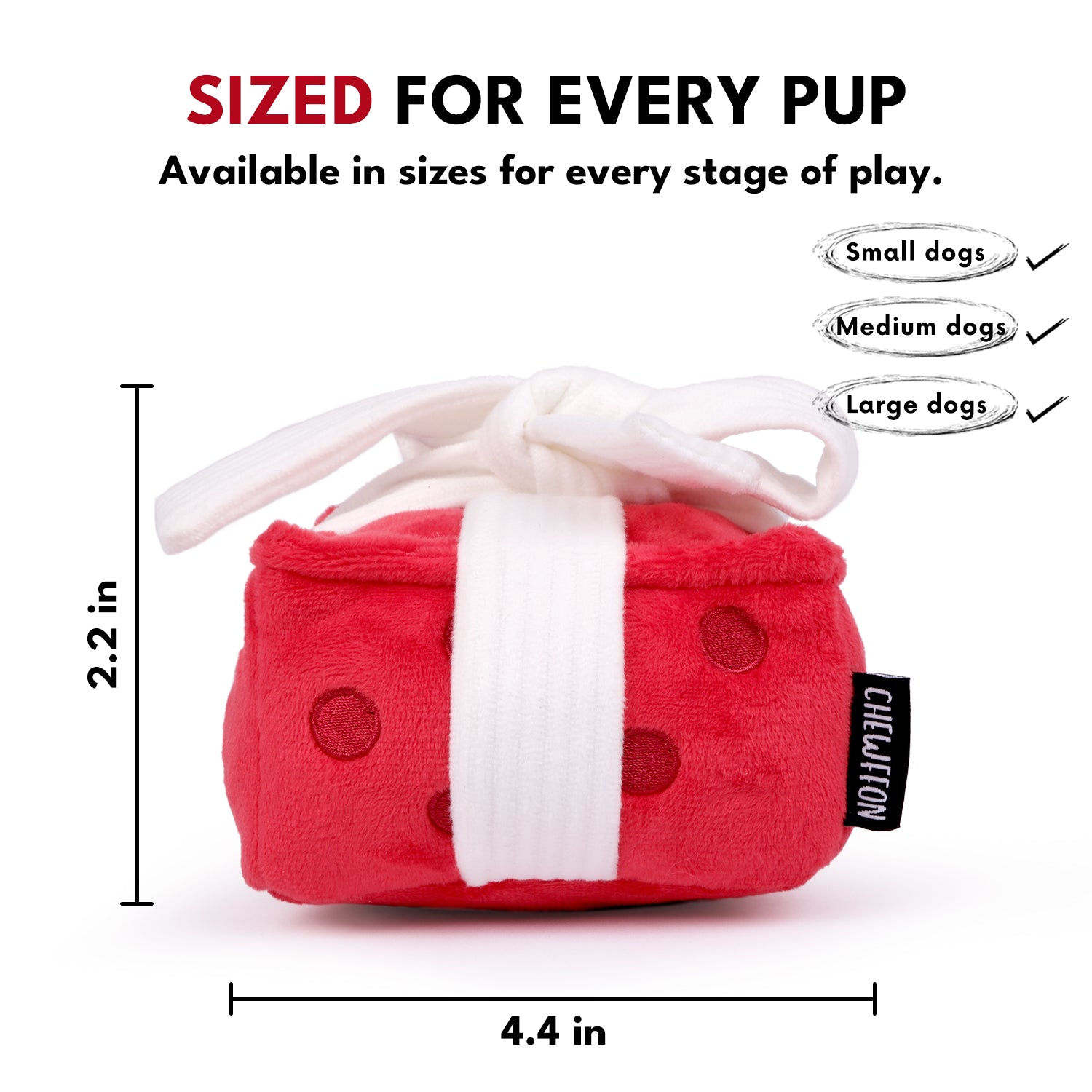 Festive red CHEWFFON gift box with two white straps—untie them to reveal a hidden treat compartment. Perfect for birthdays, Christmas, and more.