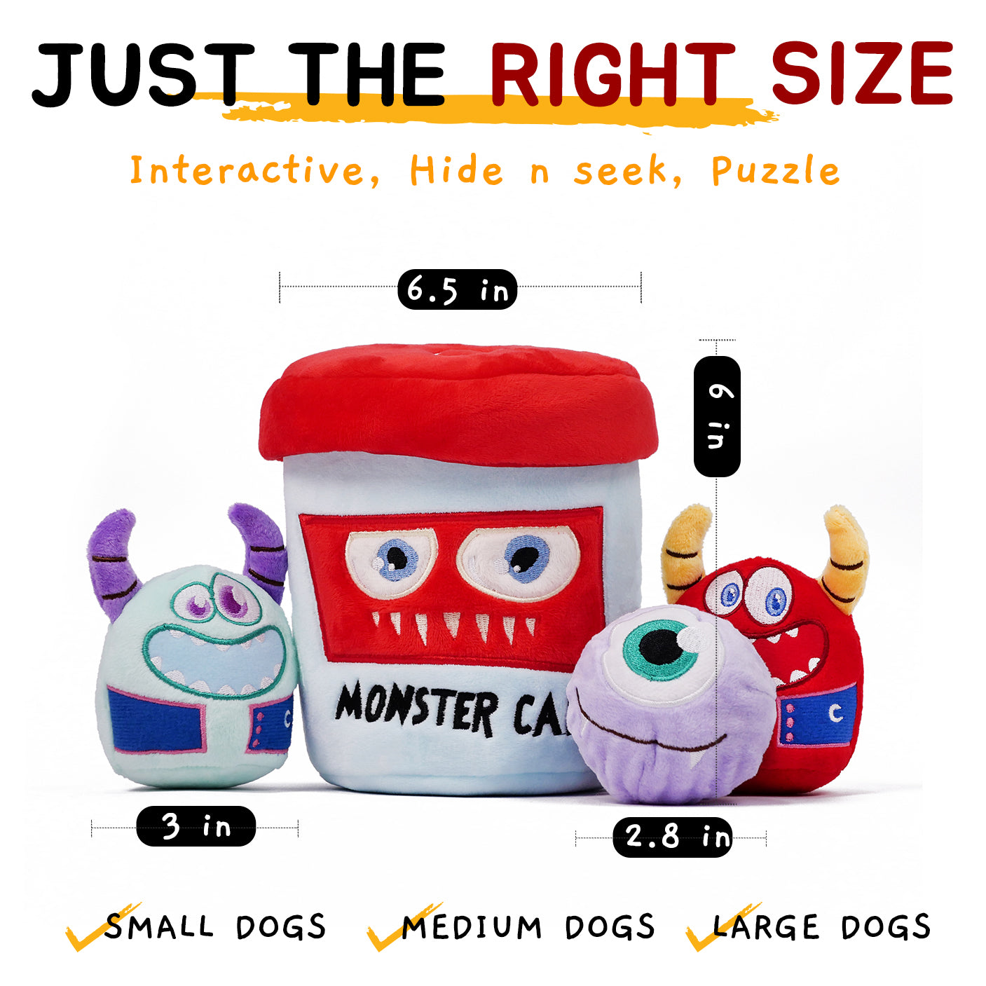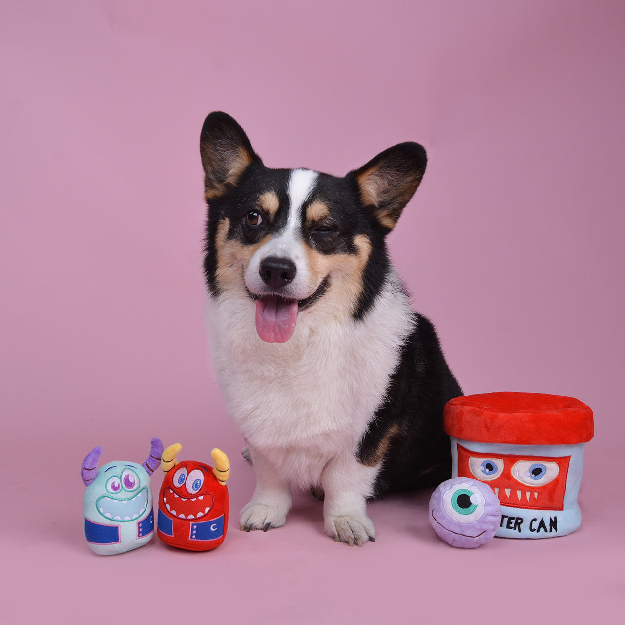 This Monster Can is easy to get your furkids engaged for hours of fun. It’s squeaky, crinkle, interactive fun. You just need to fill the three cute monsters in the monster can, toss it and let your puppy's natural hunting instincts kick in! These Mentally Stimulating Dog Toys contain three monsters toys inside of the can. The Red and Blue monsters have built-in squeaker, which is easy to squeeze. The Purple Monster contains bounce ball, which will catch dog’s attention. These toys will help dog decreased stress and boredom relief.
